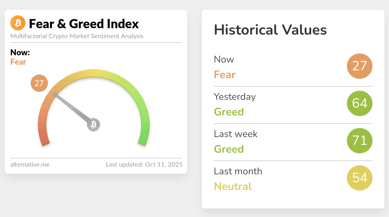 The Crypto Fear & Greed Index dropped from 64 in “Greed” territory to just 27, marking the lowest sentiment in six months. 🫣