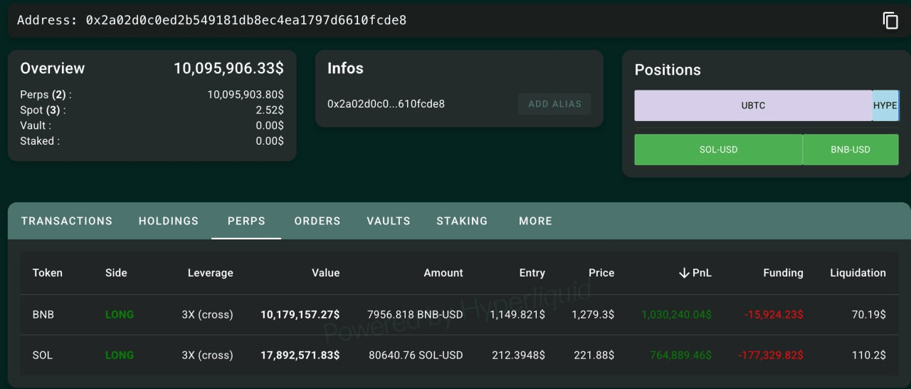 Thursday, Oct 9th: Five days after opening a 3x long on 7,957 $BNB ($10.13M), whale 0x2a02 is cruising with more than $1M in paper gains.