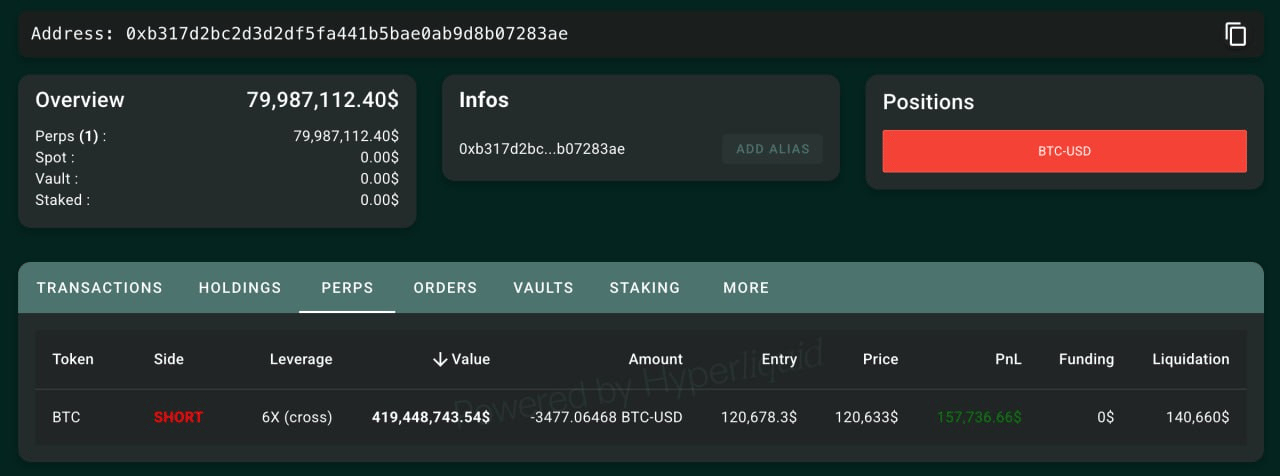 Friday, Oct 10th: A veteran Bitcoin whale sold 3,000 $BTC ($364M) earlier this week and just opened a 6x short on 3,477 $BTC ($419M)